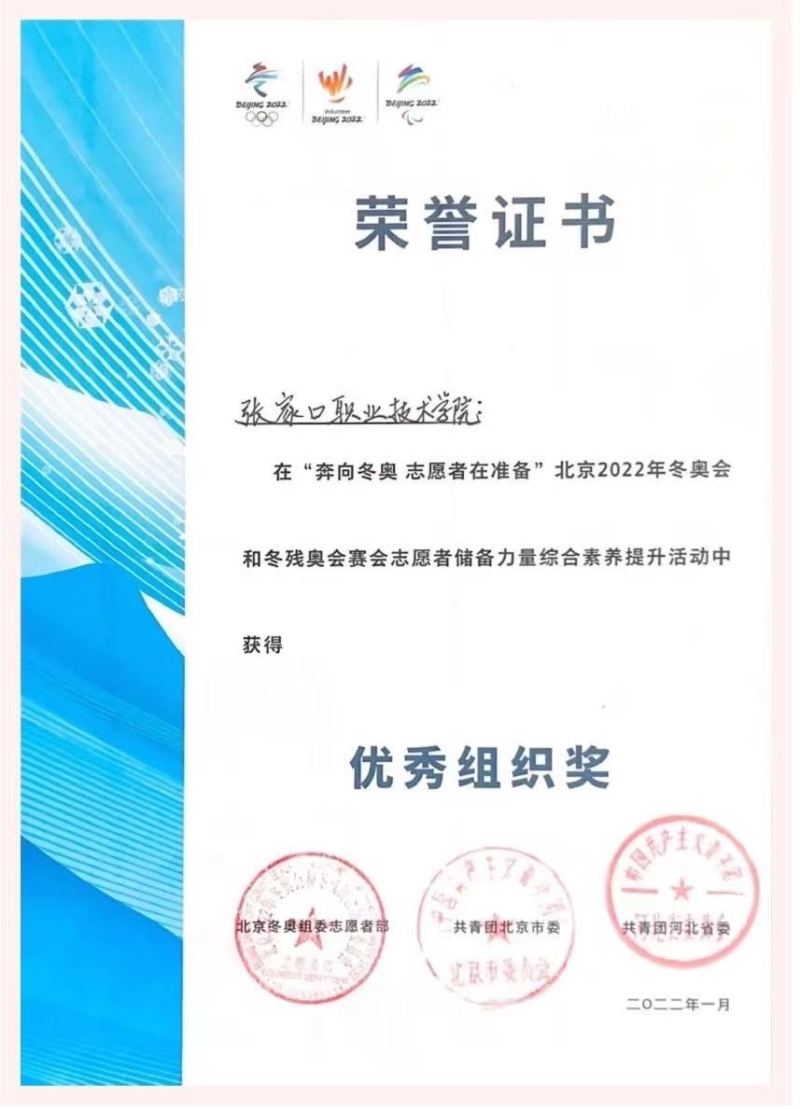 自2020年起,校青年志愿服务队以冬奥为契机,广泛宣传冬奥知识,组织师生参与崇礼论坛、省运会、世园会等大型赛会服务,逐步积累起丰富经验,全力保障冬奥会、冬残奥会赛事举办。2022年,学院团委被授予冬奥会、冬残奥会河北省先进集体、“奔向冬奥志愿者在准备”赛会志愿者储备力量综合素养提升活动优秀组织奖。冬奥志愿服务团队及4名志愿者获北京冬奥组委和河北省委、省政府表彰,3个集体、37名个人获张家口市委市政府通报表扬,7名青年教师、19名学生入选2022年新时代“冀青之星青春冬奥特别奖”。此外,校青年志愿服务队还积极参与“古长城越野赛”“崇礼168超级越野赛”等本土赛事,为游客提供秩序引导、赛事讲解等服务,展现了张家口青年志愿者的良好形象。